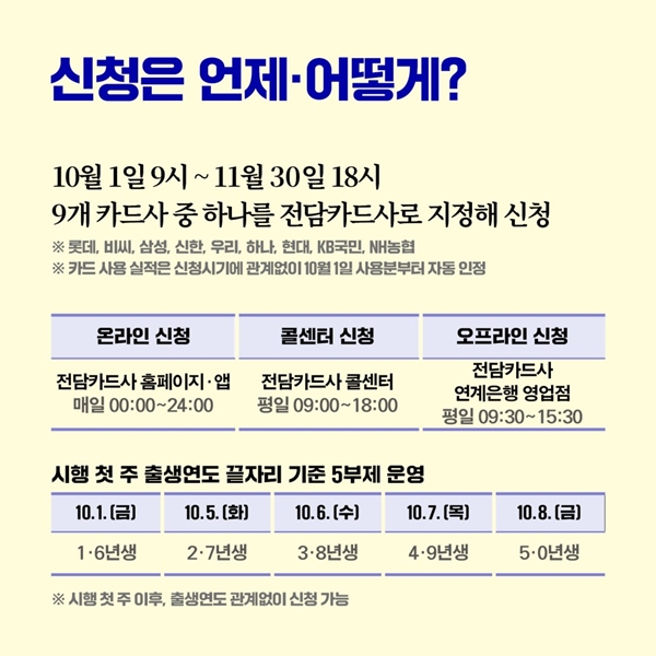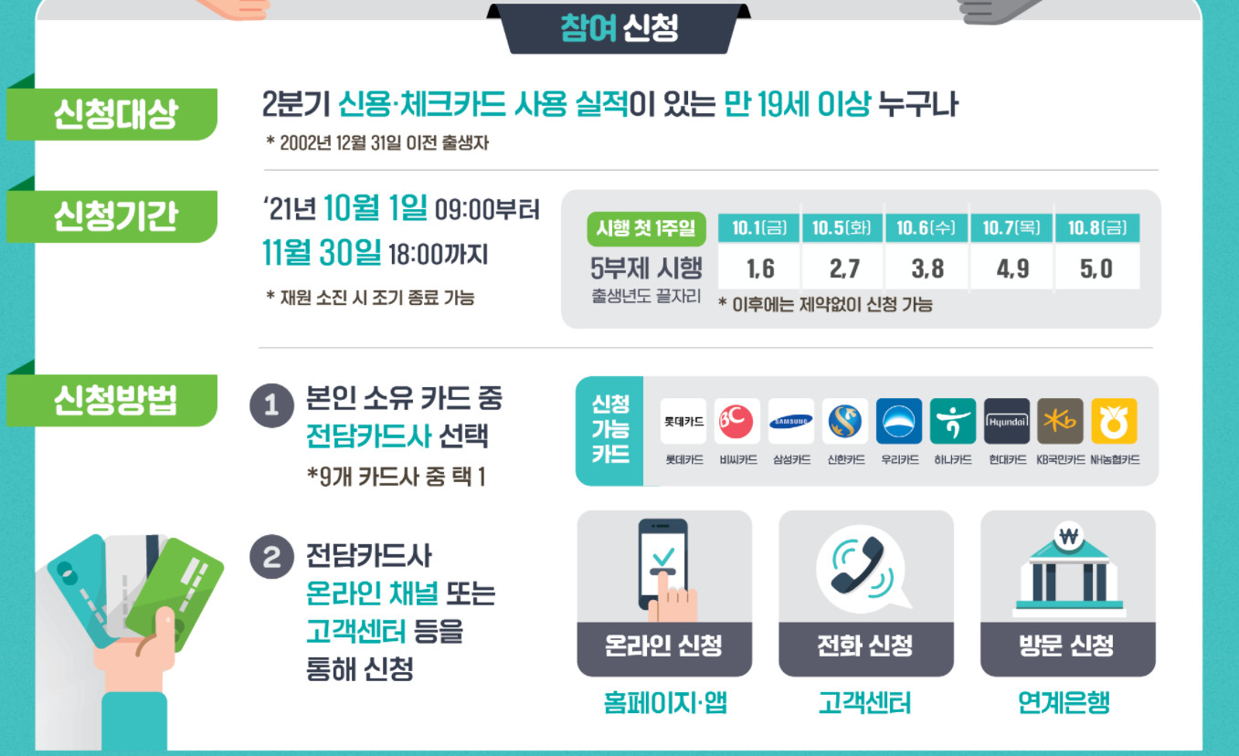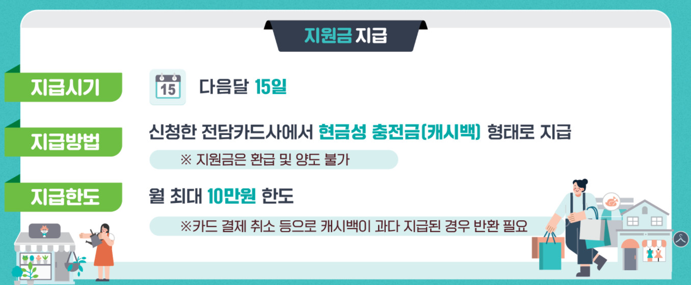 1달에 최대 10만원씩 돌려받을 수 있으며 10월, 11월 2달간 시행되기 때문에 총 최대 20만원까지 캐시백을 받을 수 있습니다.