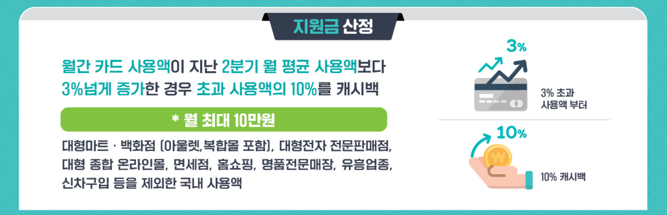과거에도 한번 시행된적이 있었습니다. 2분기 평균 신용카드 사용액보다 10월이나 11월에 더 많은 금액을 지출하면 캐시백을 해주는 제도인데요.