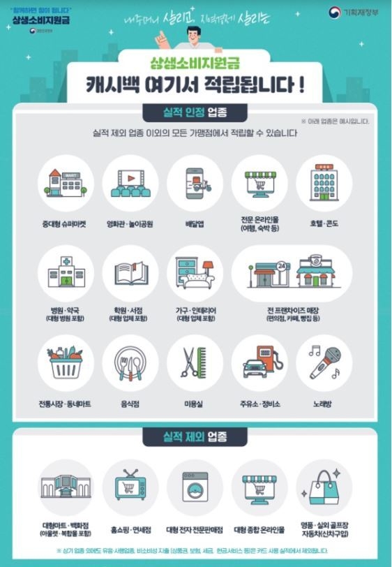 또한 대형마트나 백화점, 쿠팡, g마켓, 11번가 같은 대형 온라인몰, 골프장 등의 경우 상생 소비지원금 산정에서 제외됩니다.