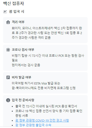 | 괌 | 격리 없음 | 음성 확인 시 격리 없음 |