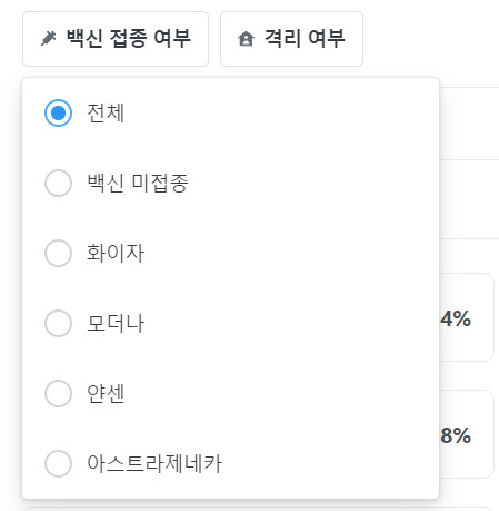 백신 접종 여부 / 백신 종류(아스트라제네카, 화이자, 모더나, 얀센) / 자가격리 여부