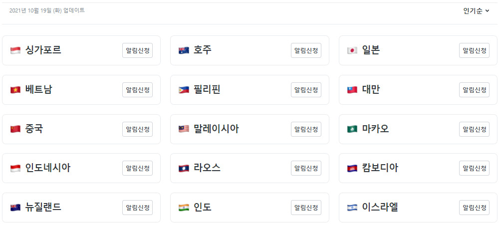 싱가포르, 호주, 뉴질랜드, 일본, 중국, 대만, 마카오, 베트남, 필리핀, 말레이시아, 인도네시아, 라오스, 캄보디아, 인도, 이스라엘은 현재 해외여행이 불가능합니다.