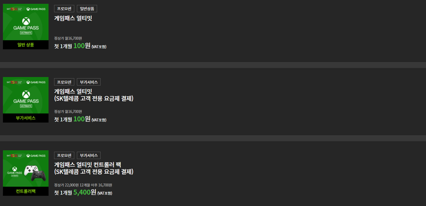 엑스박스 게임패스를 이용하는건데 skt에서 하면 첫달 100원이었다! 이 정도면 공짜!