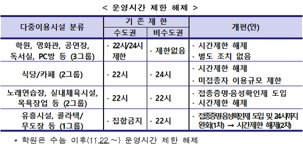 1단계는 생업시설의 운영제한을 완화하는 조치로 11월 1일부터 시행되었습니다.
