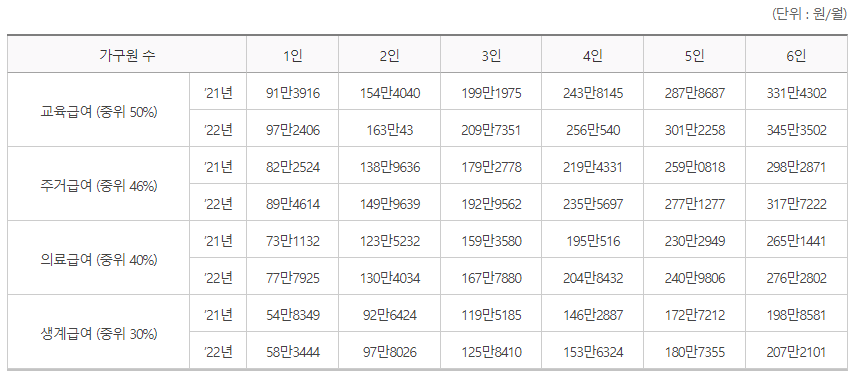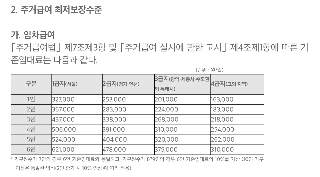 본인이 해당하는 가구에 따라 위 금액 이하면 주거급여 신청이 가능합니다.