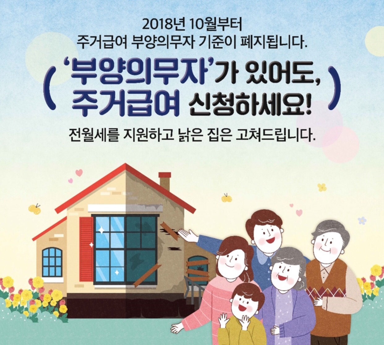 2018년 10월부터 주거급여 부양의무자 기준이 폐지되었습니다.