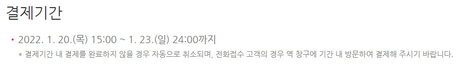 * 기간 내에 역창구에서 승차권을 발권하지 않을 경우 자동으로 예약이 취소됩니다!
