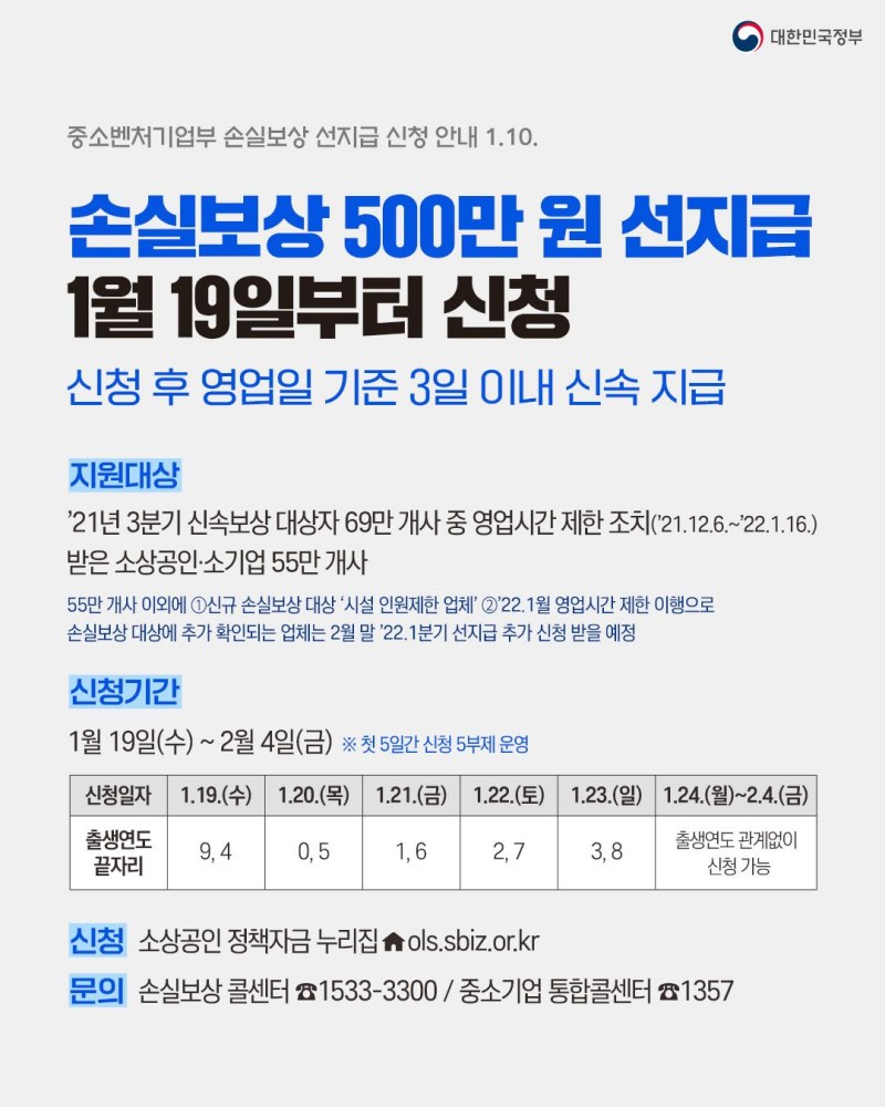 손실보상 선지급 신청 시작 후 5일간은 5부제가 적용됩니다. 5부제는 대표자의 주민등록상 출생연도 끝자리를 기준으로 실시됩니다.