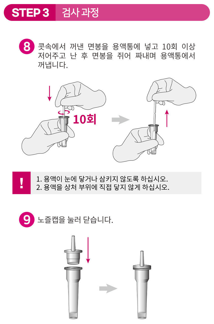 - 콧속에서 꺼낸 면봉을 용액통에 10회 이상 저어준 후 면봉을 쥐어 짜내 용액통에서 꺼내기