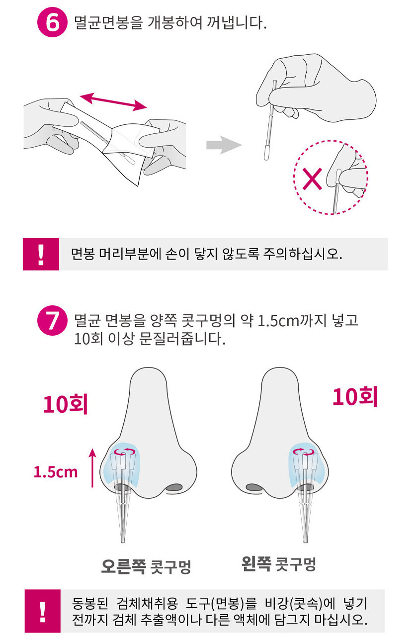 - 멸균 면봉 개봉 후 양쪽 콧구멍 안쪽 10차례 원을 그리며 문지름